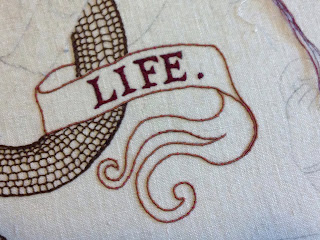 With the thin, weak light these days, I can't get much done - about 3 or 4 hours a day. And I keep making decisions that require more stitches, like the shading in the banderols. I figure another four months and I will be done, but that's a loose goal. Like Lao Tsu said: "A good traveler has no fixed plans, and is not intent on arriving."