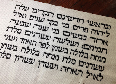 The best I can say is that it has turned out to be a humbling experience. I have confirmed my lack of aptitude for counted cross stitch. I also don't read Hebrew, so the letterforms mean zilch to me. I have to pay attention to the pattern, and even when I think I have, it turns out I made a mistake of one stitch ten letters ago and the whole thing needs to be taken out and redone. Uurrrgghhh.