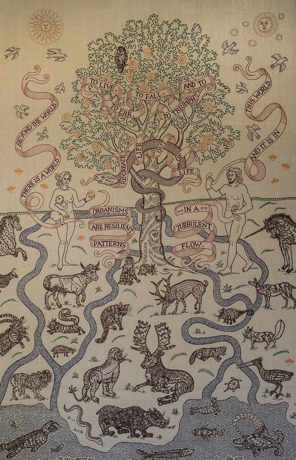 | Chaos, Flow, Meanders 2019. 44'(w) 68" (h) Hand embroidery, wool, cotton and silk on linen |